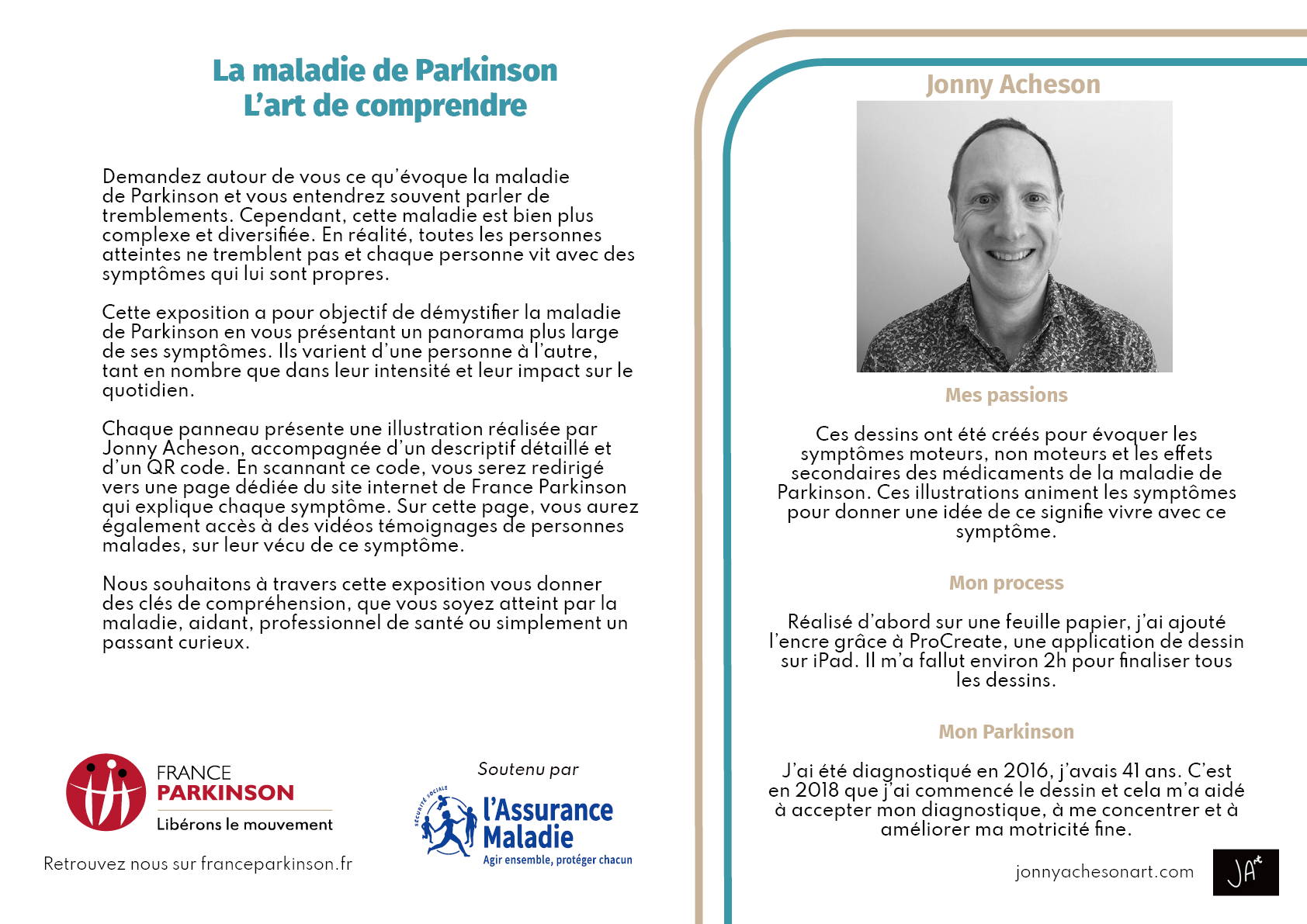 Découvrez l’exposition de France Parkinson avec les illustrations de Jonny Acheson sur les différents symptômes de la maladie de Parkinson.