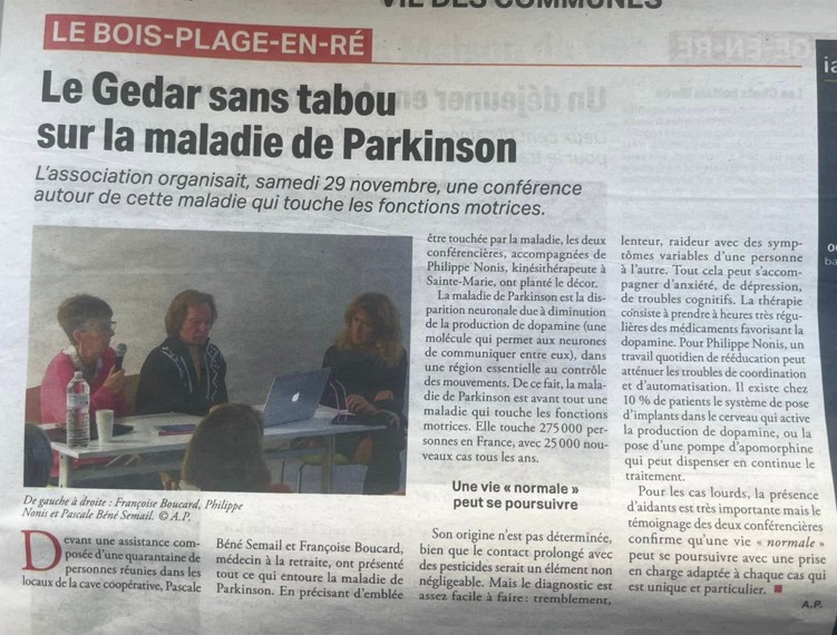 Le Groupe d’Echanges, de Développement et d’Animation Rurale de l’Île de Ré sans tabou sur la maladie de Parkinson Le Groupe d’Echanges, de Développement et d’Animation Rurale de l’Île de Ré sans tabou sur la maladie de Parkinson Accueil > Actualités > Le Groupe d’Echanges, de Développement et d’Animation Rurale de l’Île de Ré sans tabou sur la maladie de Parkinson – Le 29/11/2025 Revenir à la liste