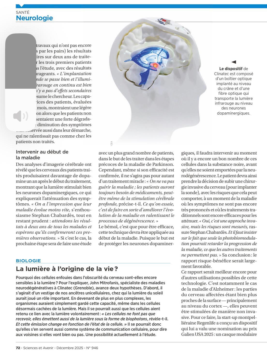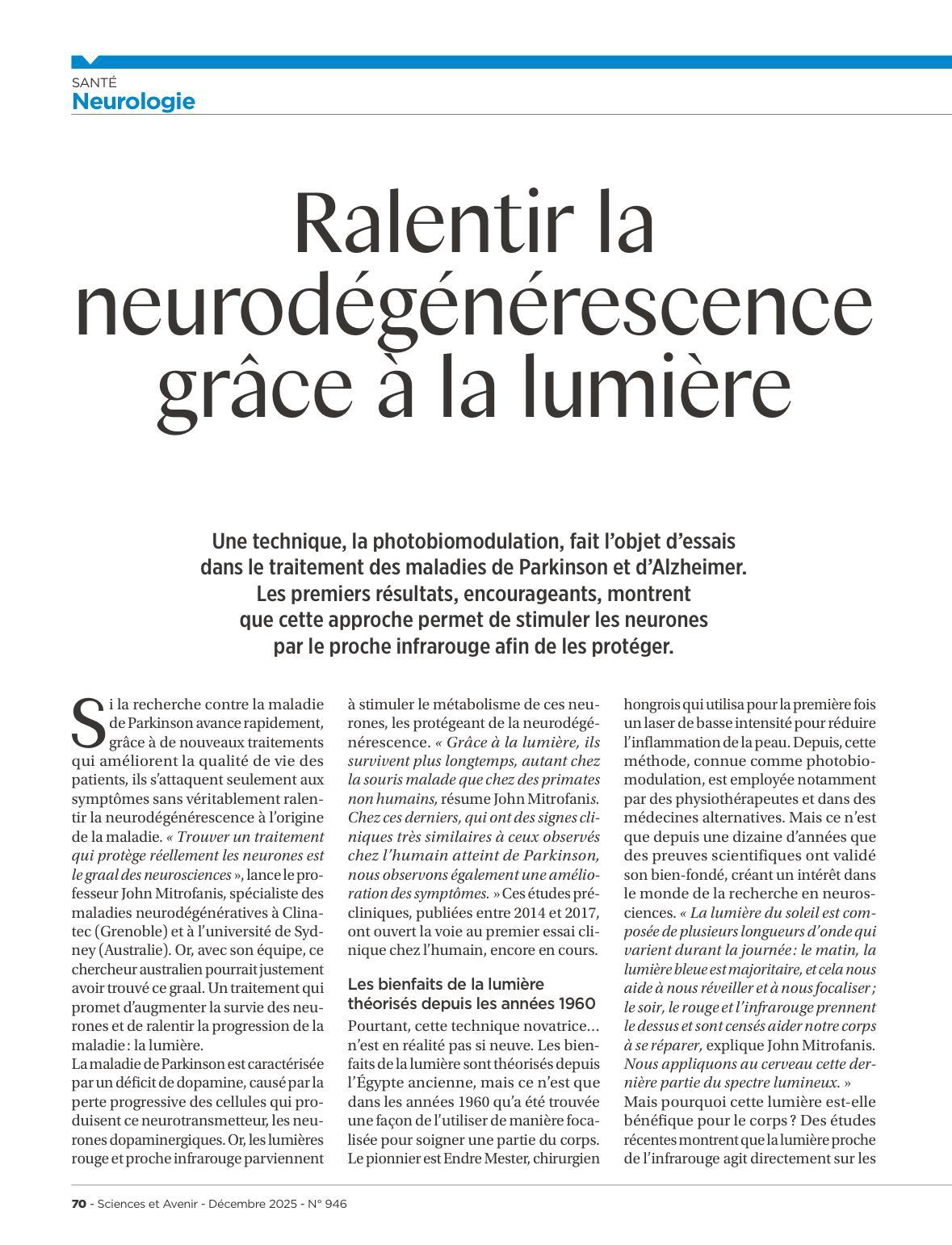 Ralentir la neurodégénérescence grâce à la lumière Ralentir la neurodégénérescence grâce à la lumière Accueil > Actualités > Ralentir la neurodégénérescence grâce à la lumière – Le 10/12/2025 Revenir à la liste