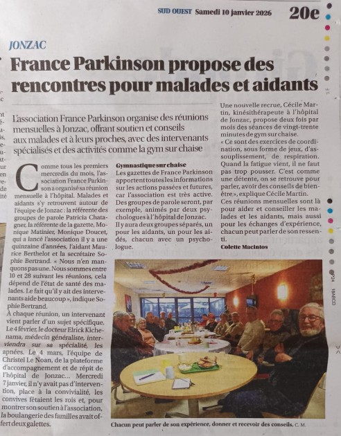 Dans le journal Sud-Ouest du 10 janvier 2026, Madame Colette Maciatos parle de l’association France Parkinson de Jonzac, et des rencontres malades – aidants