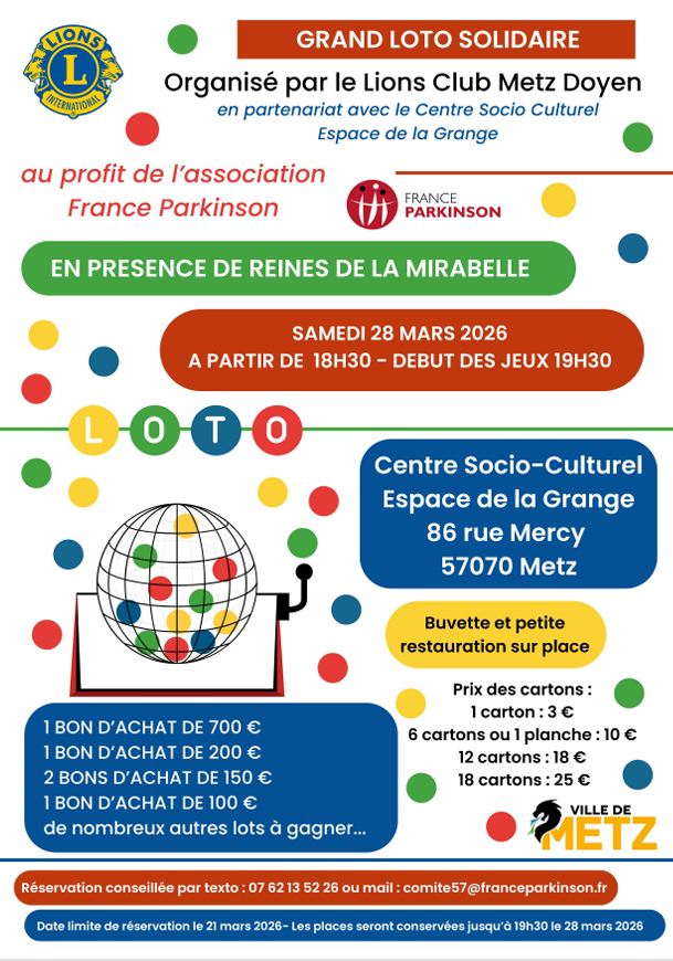 Grâce à l’organisation du Lions Club Metz Doyen, ce grand loto solidaire est une occasion précieuse de mettre en lumière notre combat et de soutenir les actions de notre Comité en Moselle. Venez nombreux pour partager un moment de convivialité et nous aider à faire bouger les choses.