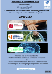 « handicaps, parlons- en! Un évènement le 19 SEPTEMBRE 2025 pour une conférence sur les maladies neuro dégénératives. Venez nombreux a la salle du conseil de la mairie de Chantilly