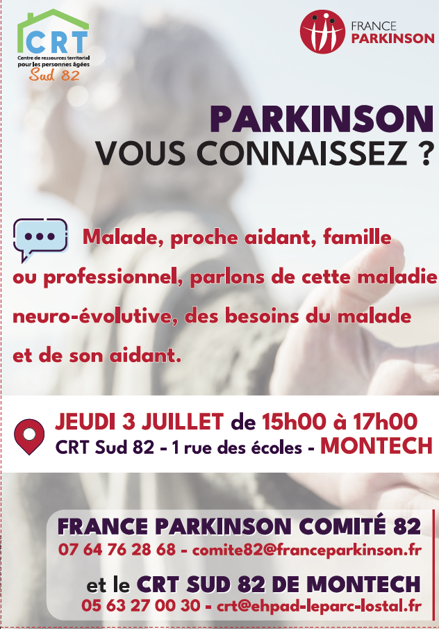 Le C.R.T. (Centre de Ressources Territorial) de Montech et France Parkinson Comité 82 vous proposent de vous recevoir, au C.R.T. (1, rue des écoles à Montech, au sein de l’EHPAD Le parc), le 3 juillet 2025 de 15h à 17h, pour vous aider à comprendre et agir sur la maladie avec ses effets indésirables, à apprendre à vivre avec Parkinson et à accompagner un parkinsonien.