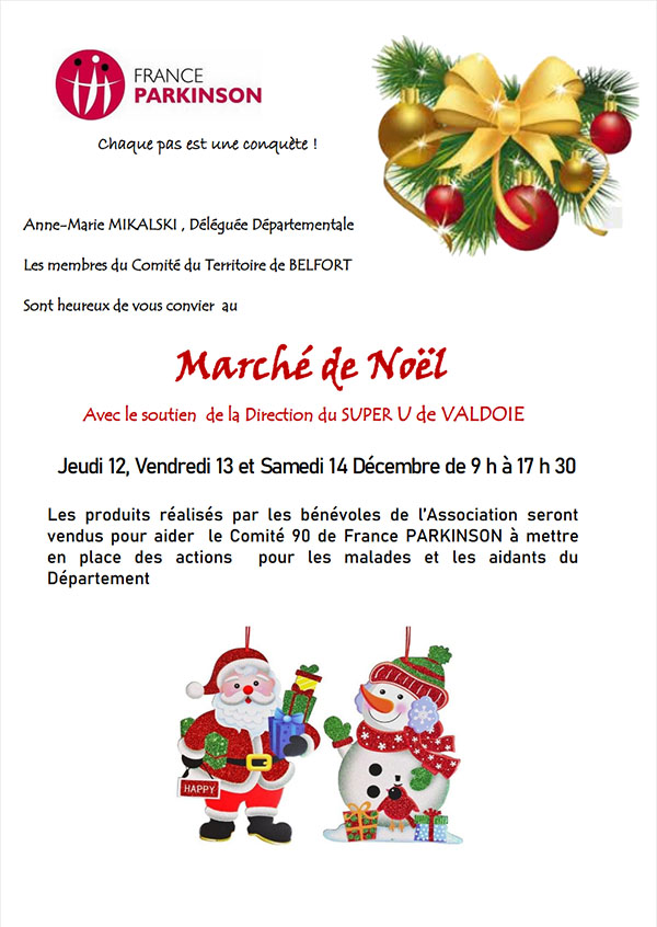 Marché de Noël Père Noël Marché de Noël Accueil » Evénement » Marché de Noël Retrouvez nous au marché de Noël du Super U de Valdoie du jeudi 12 au samedi 14 décembre ! retour au comité Revenir à la liste