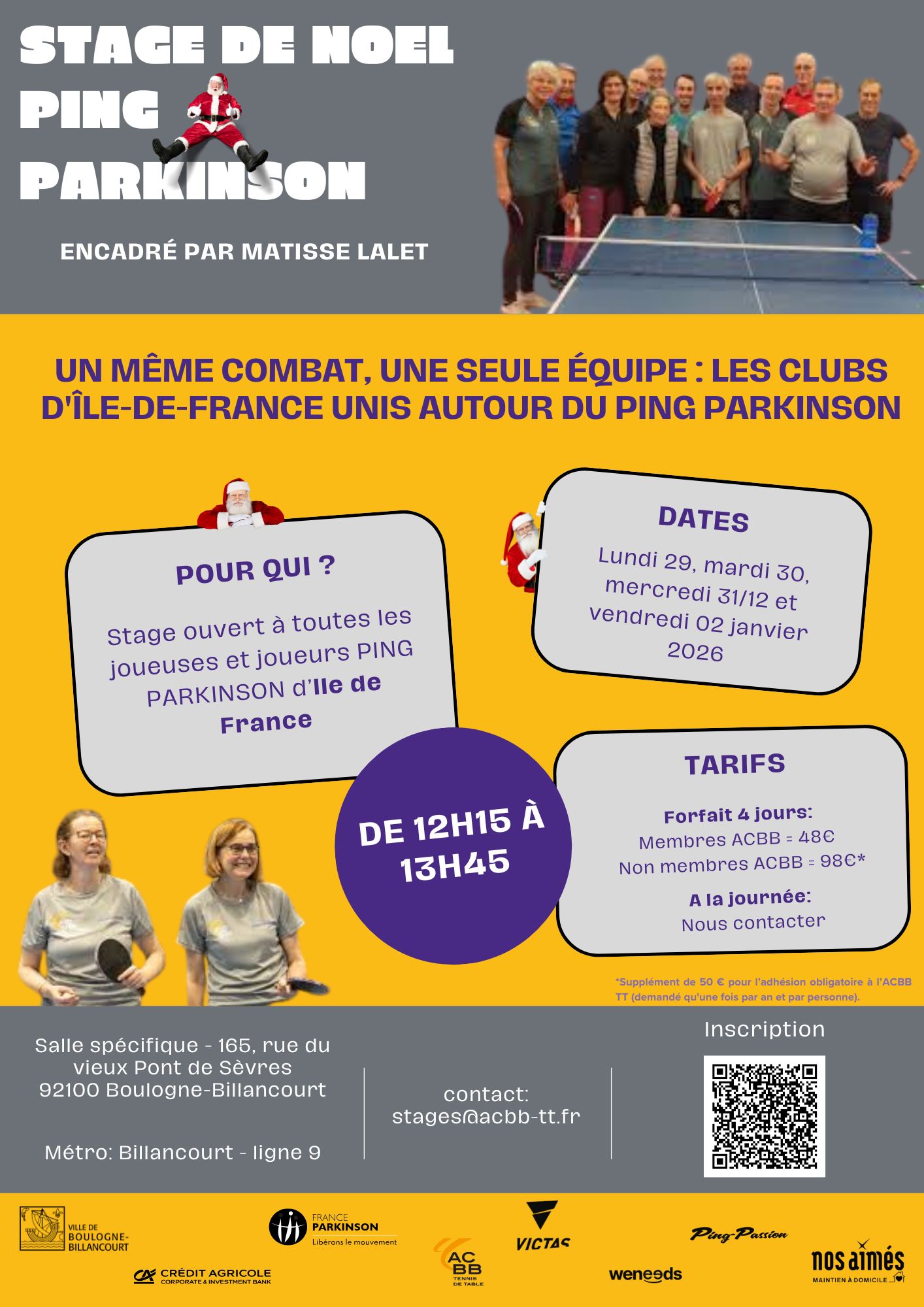 Stage de Noel Ping Parkinson / Boulogne-B. 92100 / 29, 30, 31 Décembre 2025 et 2 Janvier 2026.