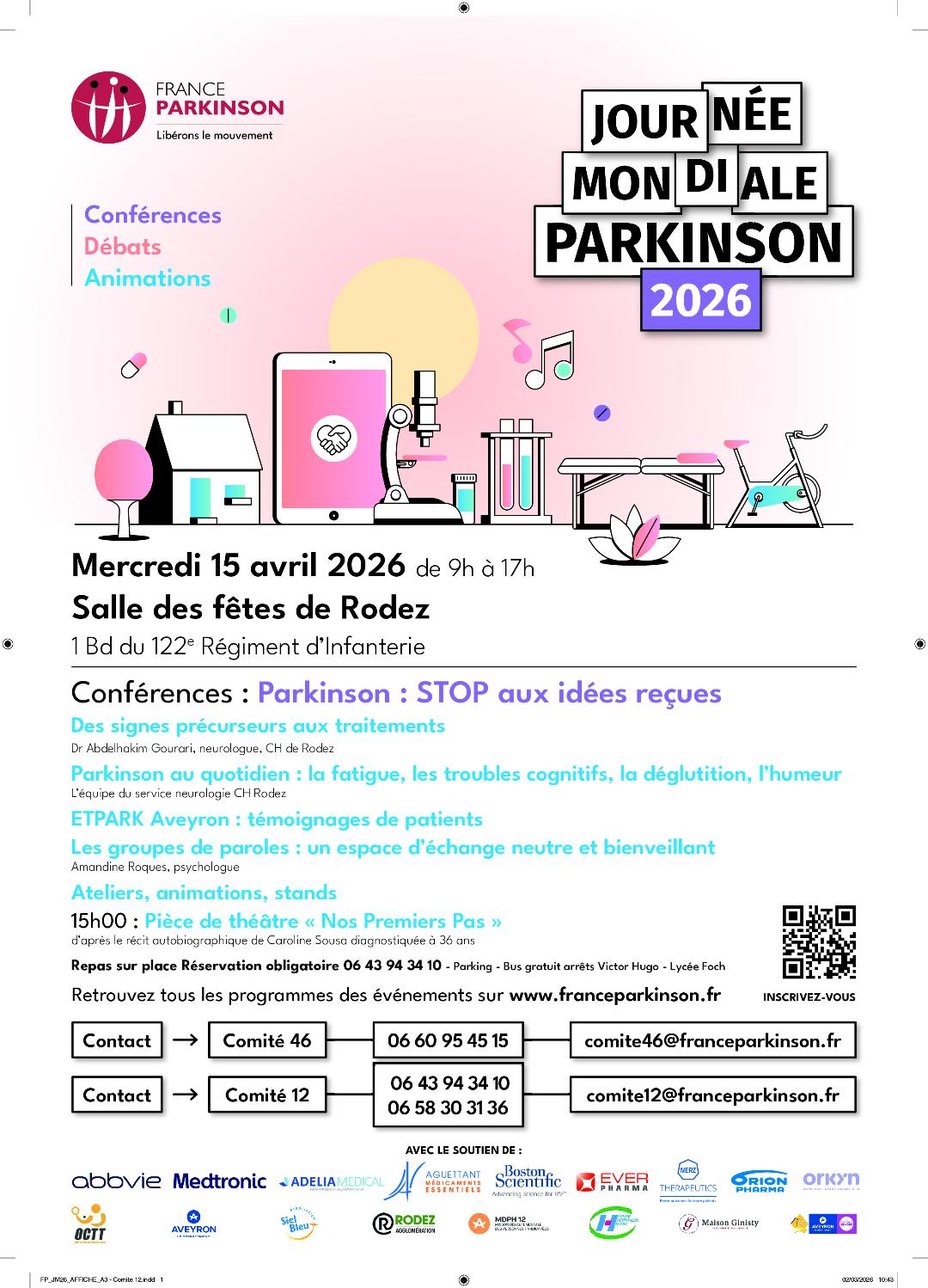Le Comité France Parkinson 46 s’associe cette année au Comité 12 – Aveyron pour l’organisation de la Journée Mondiale Parkinson 2026, qui se tiendra à Rodez le 15 avril 2026.