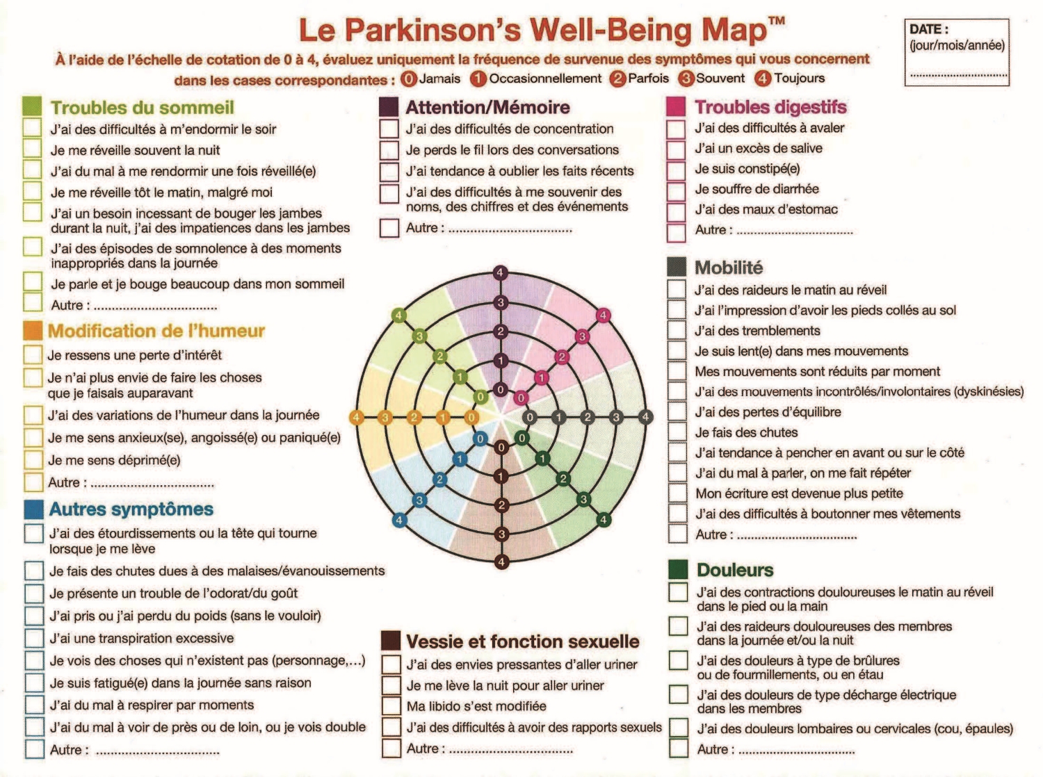 littéralement « carte du bien-être dans la maladie de Parkinson », qui touche à tous les aspects de la vie quotidienne : sommeil, alimentation, douleurs, mobilité…